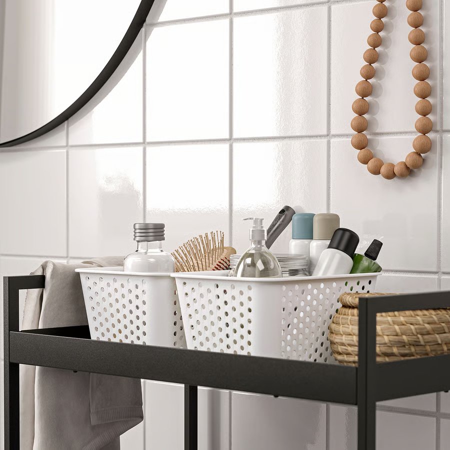 Helps you organise small things that otherwise easily disappear and is just as great on a shelf in the livingroom as in a bathroom cabinet.
